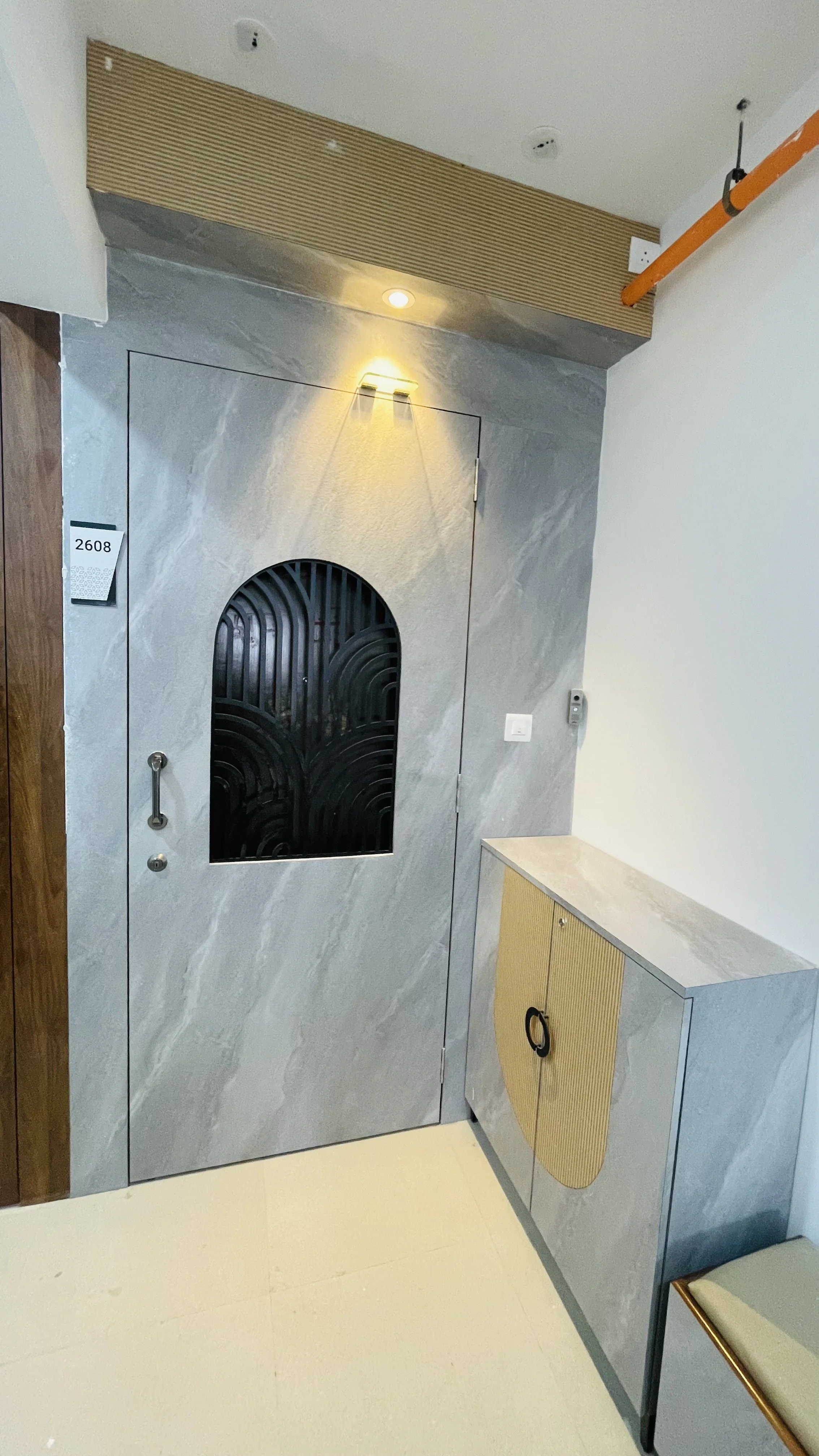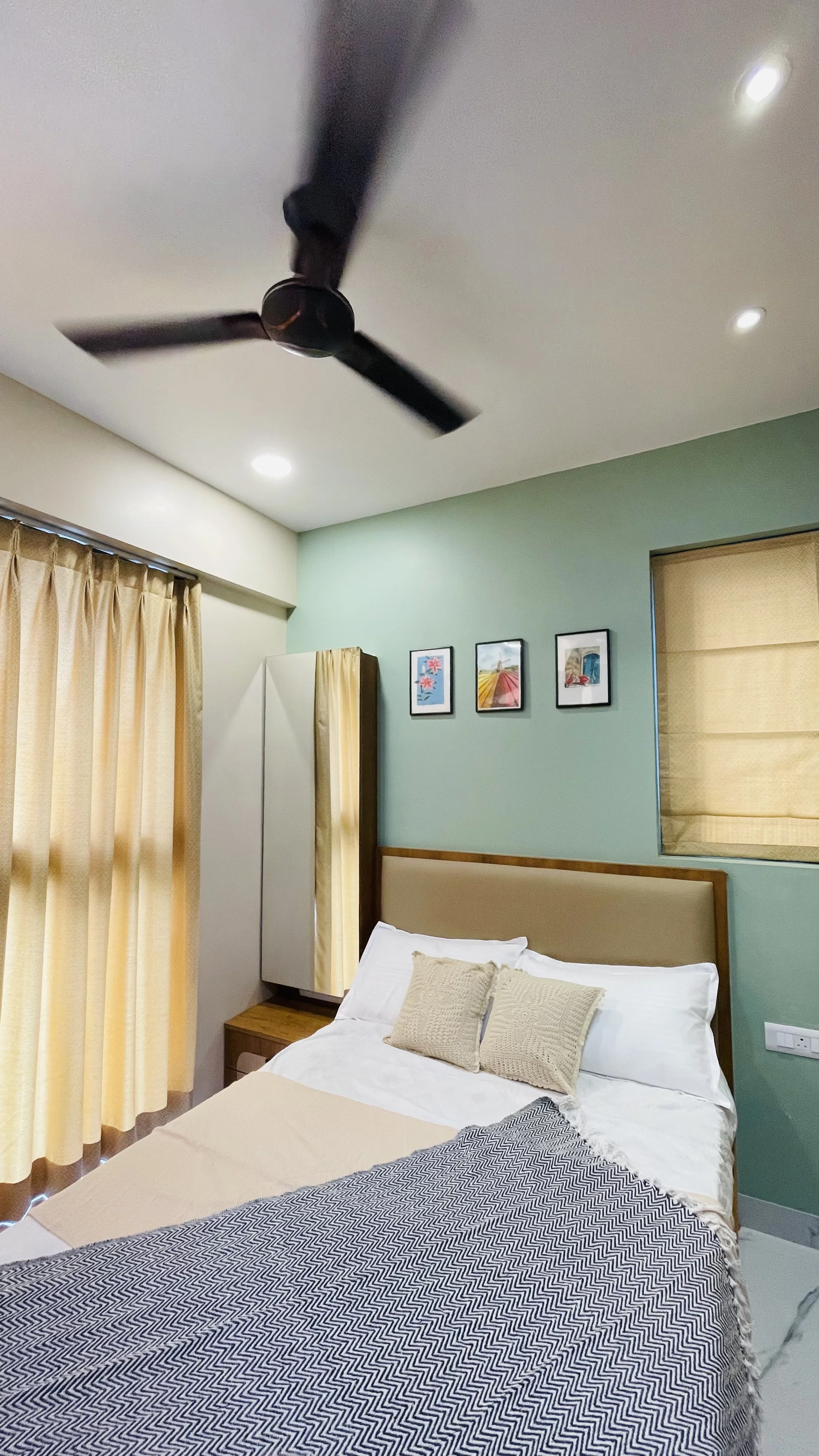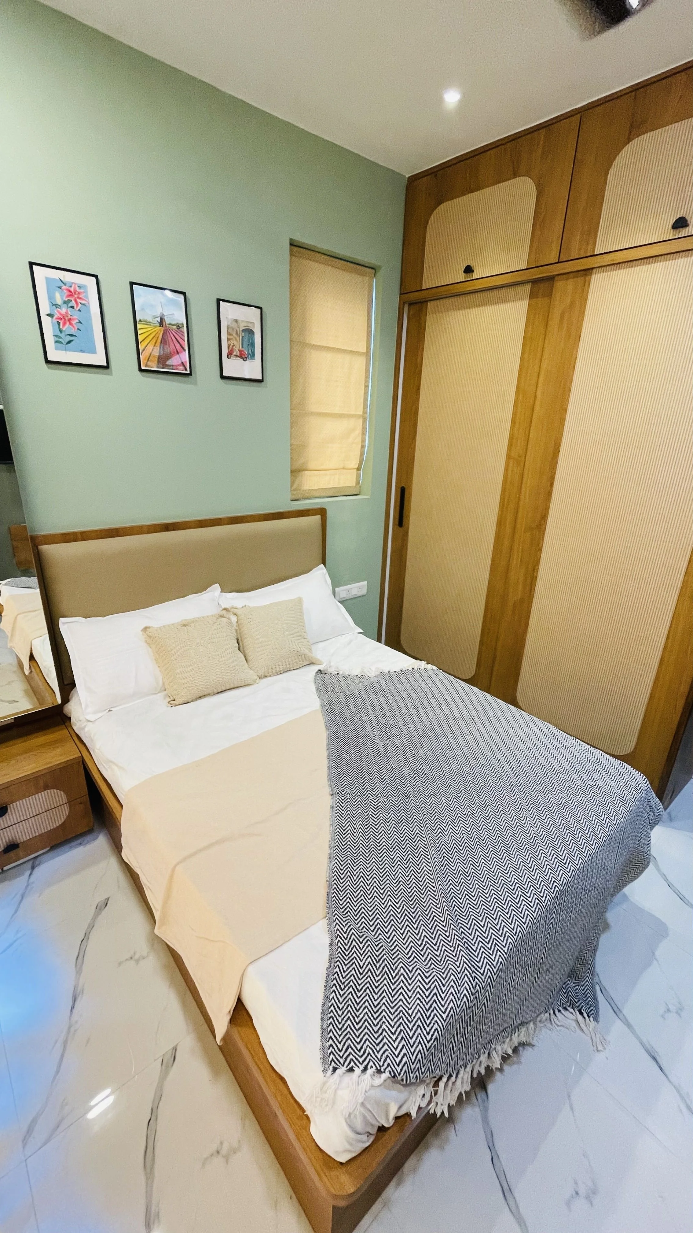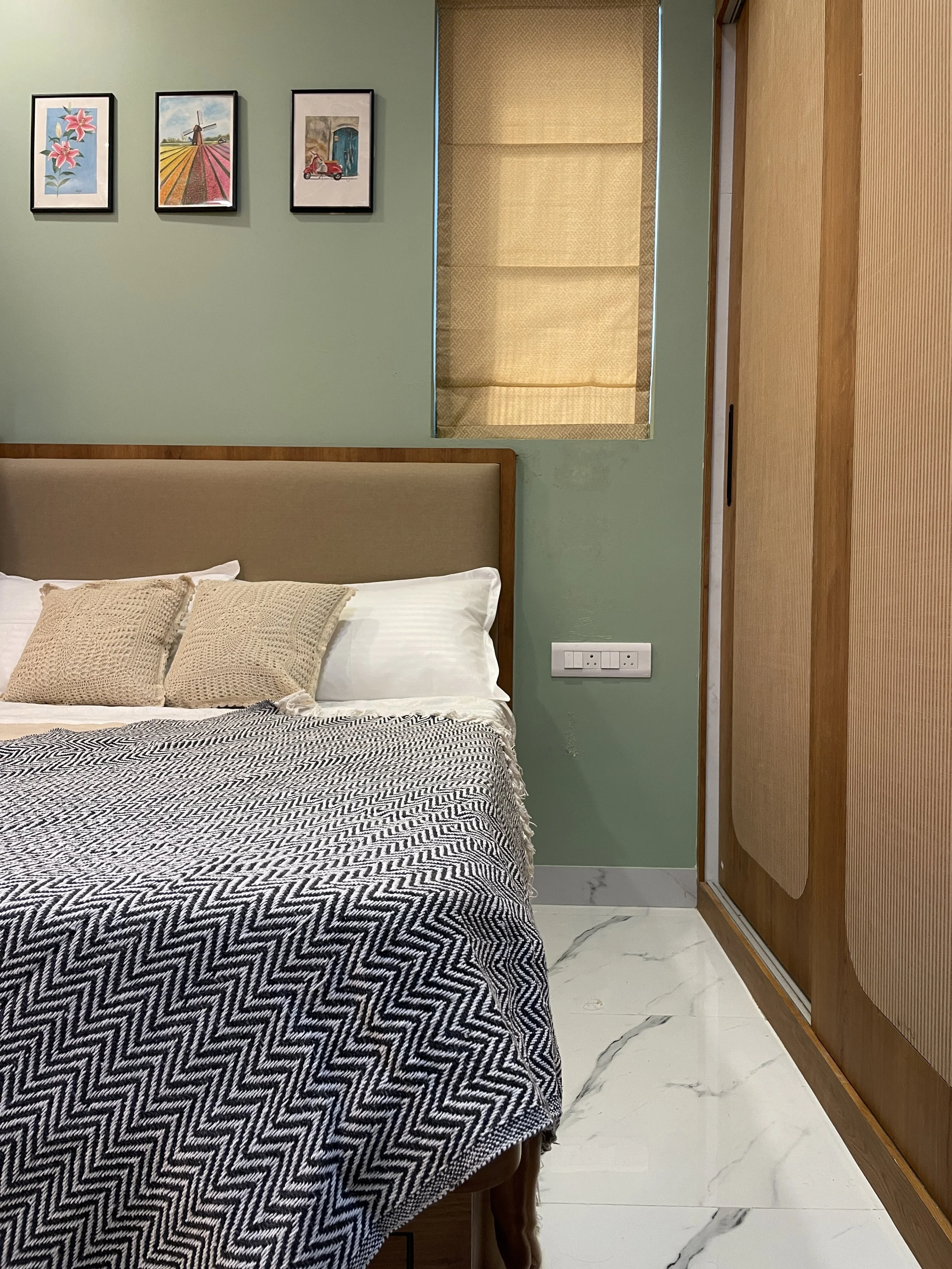 Material Harmony: The bedrooms celebrate a wooden theme, elevated by woven cane laminates on the wardrobes. This choice introduces a vintage, artisanal touch that bridges the gap between modern design and rustic comfort.